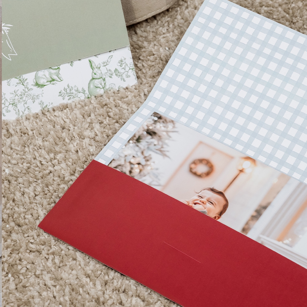 A brand-new addition to this year’s collection! The new Christmas Pocket Cover have been designed to make your deliveries even more special. Featuring one of three available festive designs, this version includes an inner pocket where you can store photographs. A magical and practical touch for your Christmas sessions.