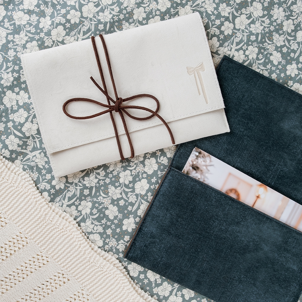 A Christmas Print Bag is covered in premium velvet, providing space for up to 12 photographs while combining elegance with protection. With the option for personalised laser engraving and a charming round leather cord closure, this bag transforms the delivery of images into a truly magical experience.