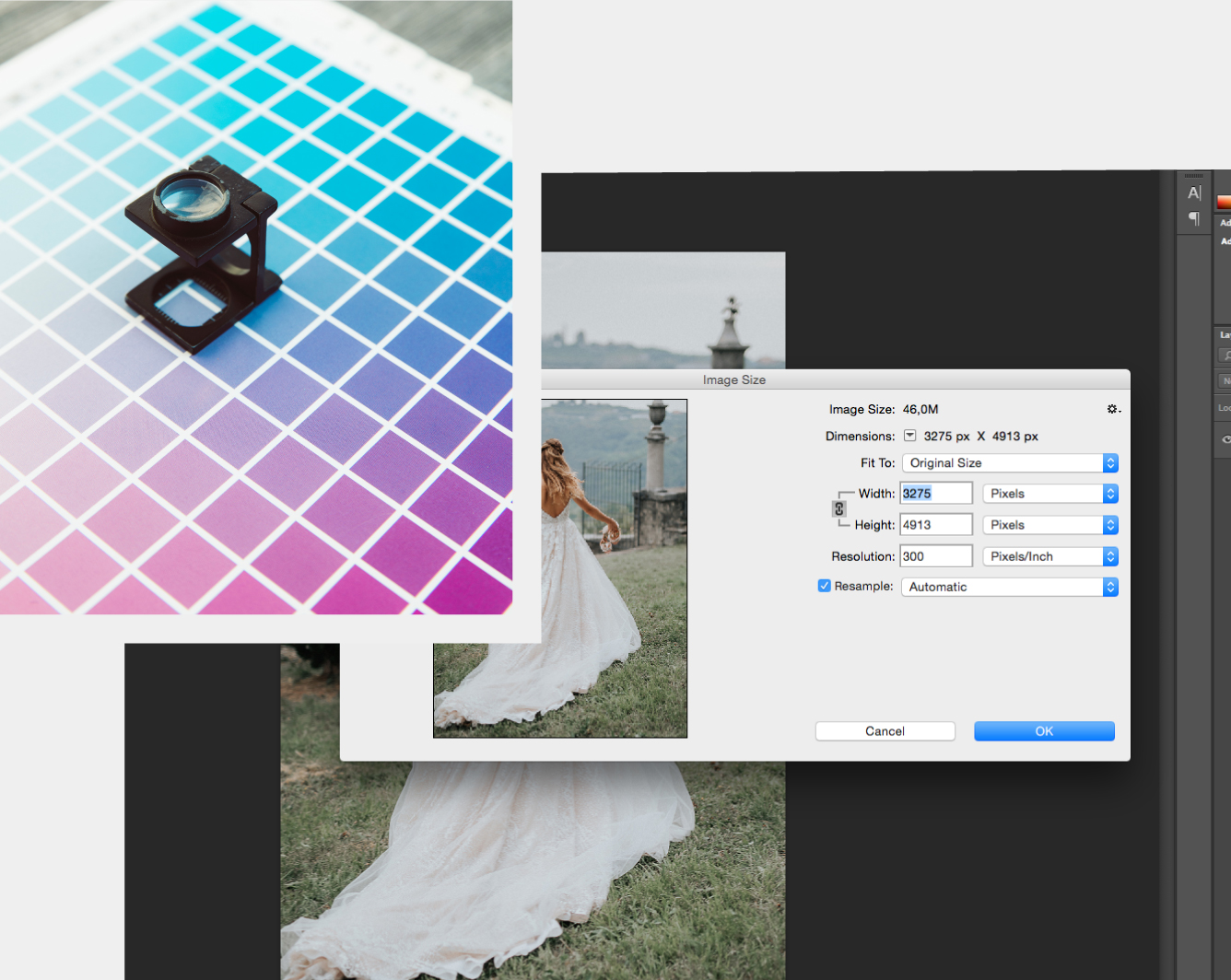 Before starting the layout check the measurements of the format you have selected as well as its orientation, the correct positioning of the images is essential so that no unwanted margins or over-cut images appear in the print. If you want to have images that have a white border all around you should leave a white border between the image and the guide, on the other hand if you want the image to fill the whole area, it will have to occupy all the free space, including the cutting margins. When occupying the whole area you should follow the indications as illustrated in the image beside and described in the point "Safety margin".